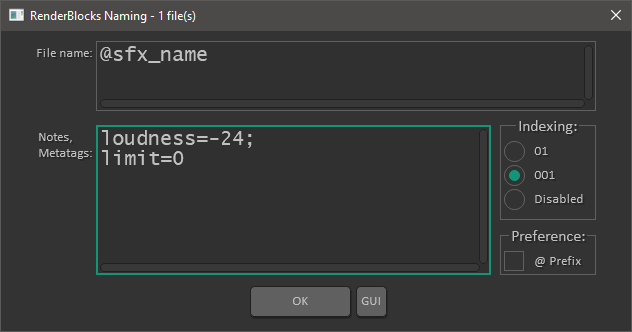 You can also set up some render normalization and brick-wall limiting settings with metatags per block. With loudness= you define the green value from the example below and with limit= you define the blue value from the image below.